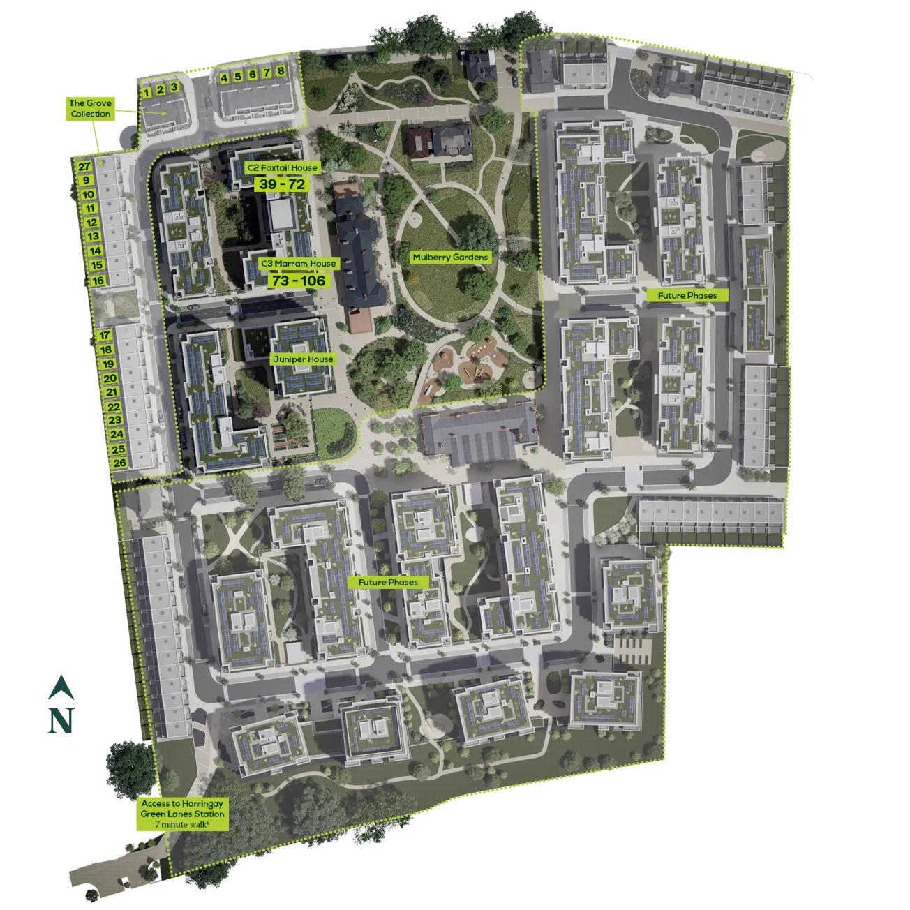 Beautifully designed apartments and houses for sale in Harringay, North London. Set around a lush central garden, each home offers private outdoor space and modern living in a peaceful, leafy neighbourhood.
